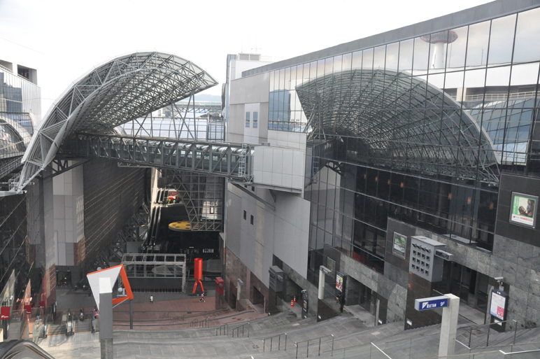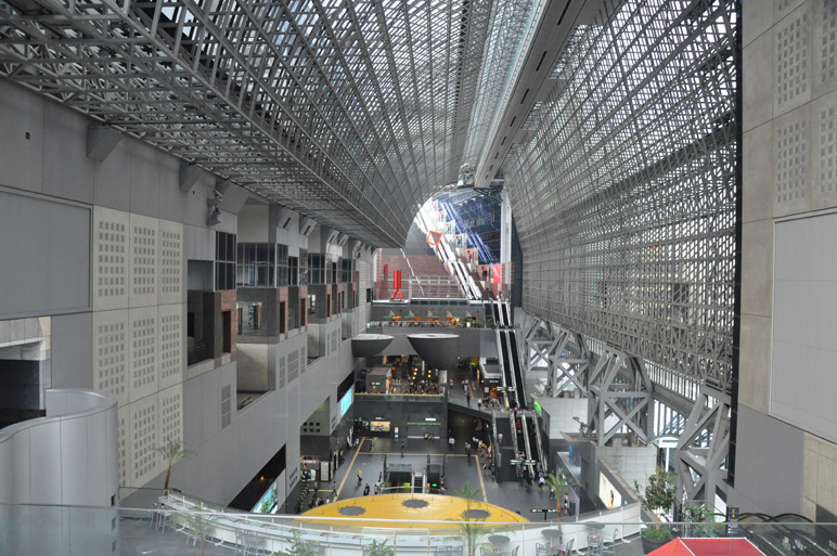 From Wikipedia: The current Kyōto Station opened in 1997, commemorating Kyoto's 1,200th anniversary. It is 70 meters high and 470 meters from east to west, with a total floor area of 238,000 square meters. Architecturally, it exhibits many characteristics of futurism, with a slightly irregular cubic facade of plate glass over a steel frame. The architect was Hiroshi Hara.