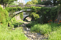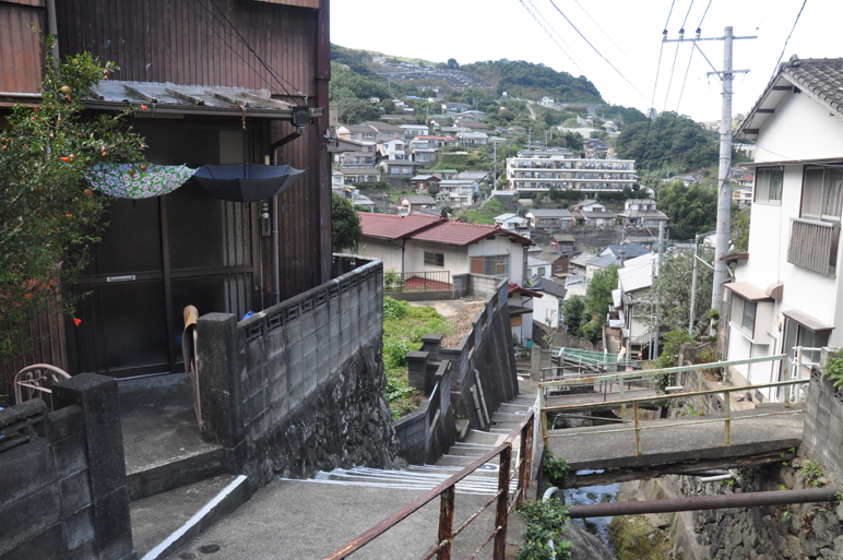 Nagasaki is an interesting city to walk around because of its geography and especially as that geography influenced its reconstruction. Its hills rolling into the ocean give it a great skyline day and night. The hillsides leeward of the bomb's force remained largely untouched, so there is an mix of old and new buildings. Carved out among every neighborhood are vegetable and flower gardens which cling purposefully to every free piece of dirt. Reflective of the Japanese aesthetic sense, there is a balance of ordered purpose and untouched happenstance. There are roads in every neighborhood and places for families to park their cars, but it looked like every neighborhood had a network of stairs and narrow alleys that form a smaller sub-grid. These alleys more closely follow the countours of hills and streams. Where room is lacking for gardens you see pots, planters, and trellises.