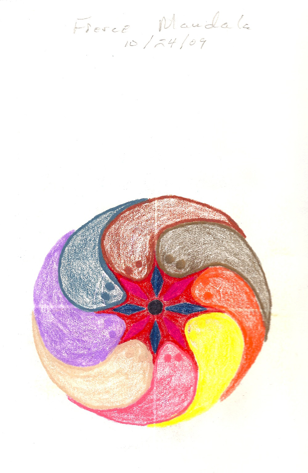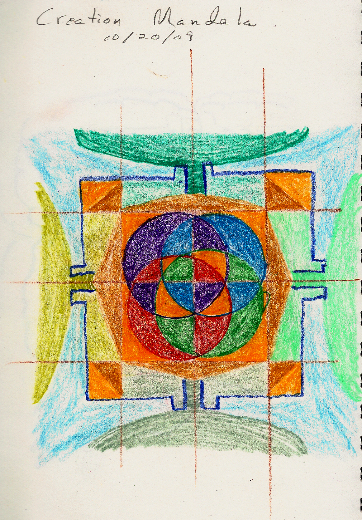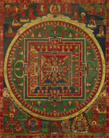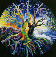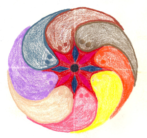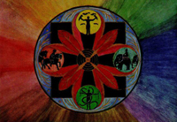 The New Oxford American Dictionary defines mandala as a geometric figure representing the universe in Hindu and Buddhist symbolism. The word itself comes from Sanskrit meaning 'disk'. Within psychoanalysis, mandalas sometimes present themselves as a symbol in a dream, representing the dreamer's search for completeness and self-unity. Examples of some of my own mandalas are seen on these first two pages: the broken compass, fierce mandala, and creation madala. Mandalas represent a certain type of cosmology at a given point in time. They are, by their nature, transitory. Nonetheless they represent a sacred geography. If they are a momentary glimpse into the individual or archtypal soul of humanity, they are still sacred images because they represent the core of an individual or collective self. Tibentan monks create beautiful and intricate mandalas mandalas out of colored sand. After a painstaking and exacting creation which would be artistically worthy of preservation, they destroy their creation since it only represents a snapshot of the time in which it was created. Japanese buddhist mandalas, on the other hand, are usually preserved as objects which assist with prayer. These mandalas serve as guideposts to enlightenment.