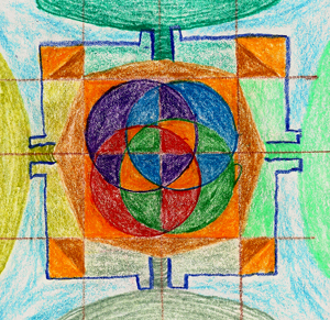 The first three mandalas on this page are my own creations. I won't say here what any of these represent to me, but I instead provide them for your benefit. Perhaps they can spark your own imagination. What elements of your life at this moment are foundational to everything else? What are you building on top of that foundation? What in your life causes you to look inward? What forces give you life and propel you outward? The first is a basic field you see under most Tibetan mandalas. These four triangular fields represent the basic cosmological forces of creation upong which everything else is built. Click here to see an example of how a Tibetan mandala builds on this basic field.