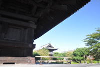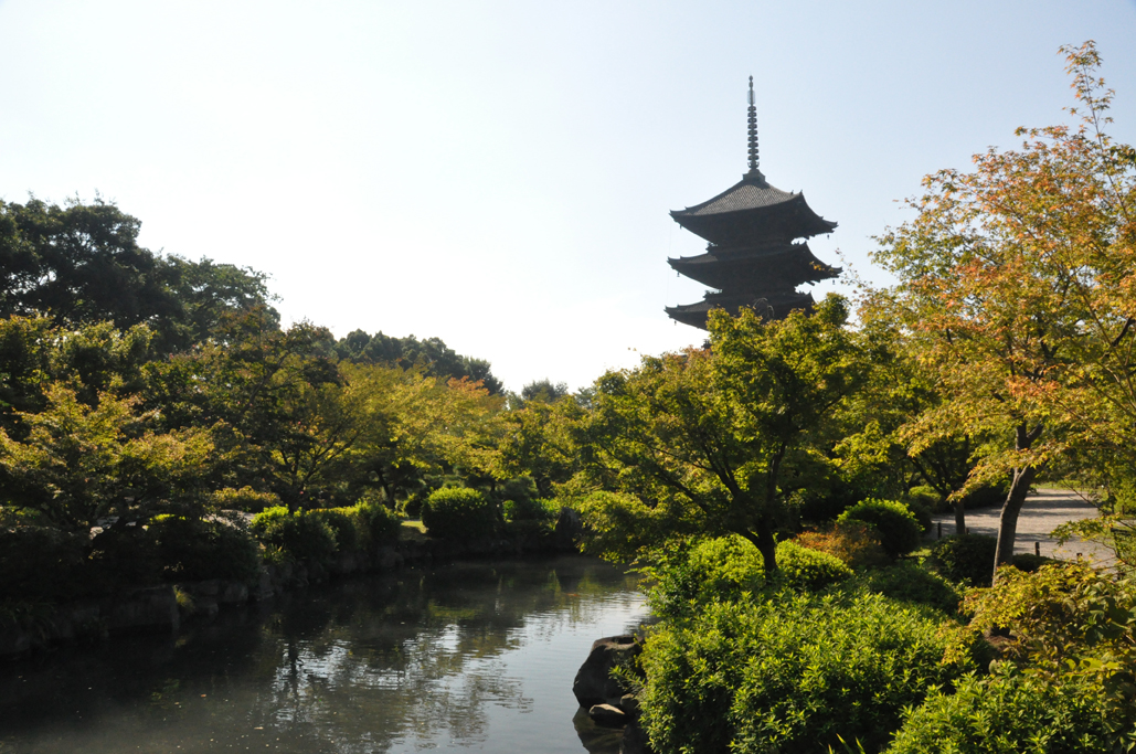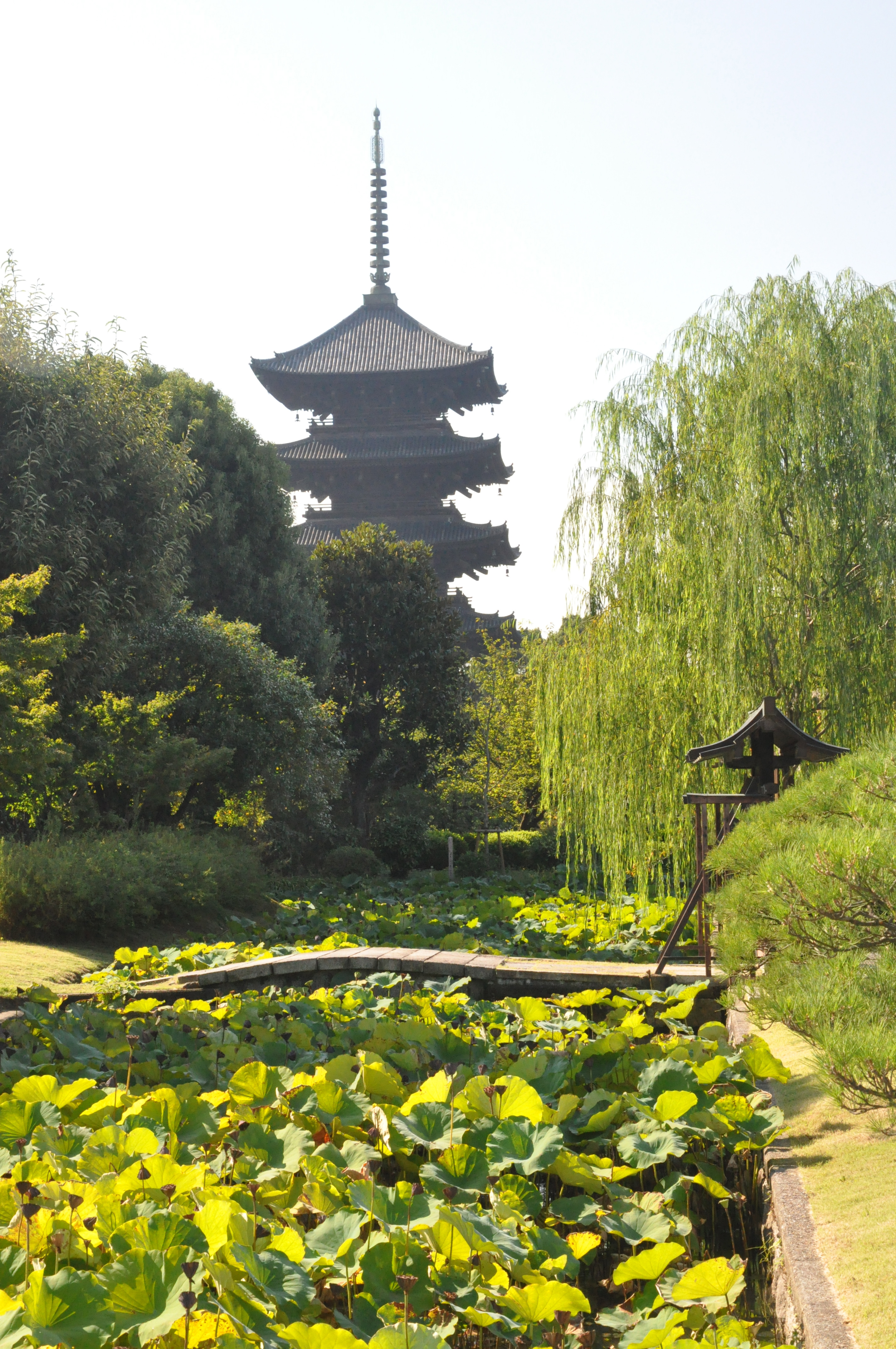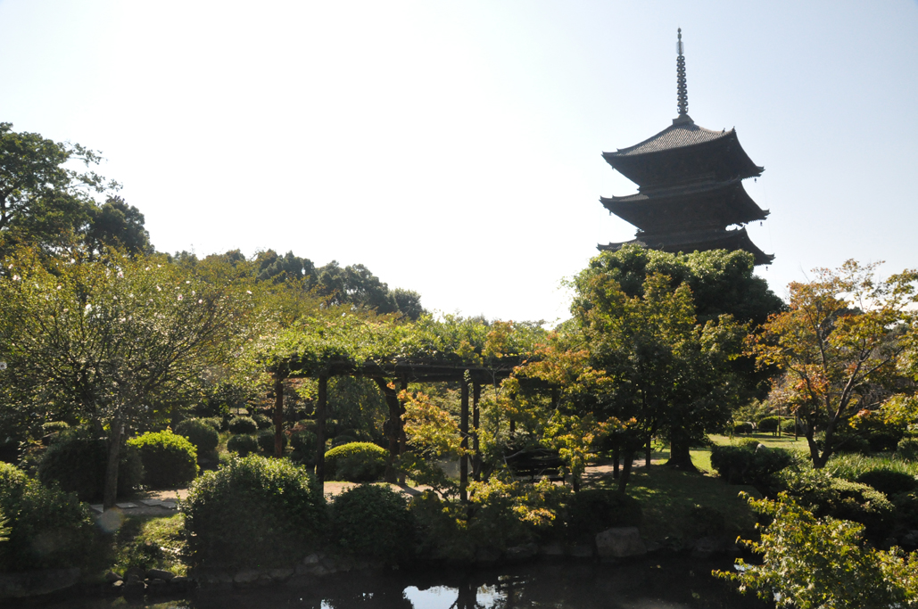 The imperial capitol was moved from Nara to what would become Kyoto because of the belief that powerful Buddhist priests had too much influence over the imperial court. As a result, To-ji and Sai-ji were the only temples which the Emperor Kammu allowed built in the Heian capitol. To-ji was built in 796AD, in part to guard the city. To-ji is located southwest of the JR Kyoto station, within easy walking distance. Its five story pagoda is a symbol of the city, and easily seen from the passing Shinkansen.