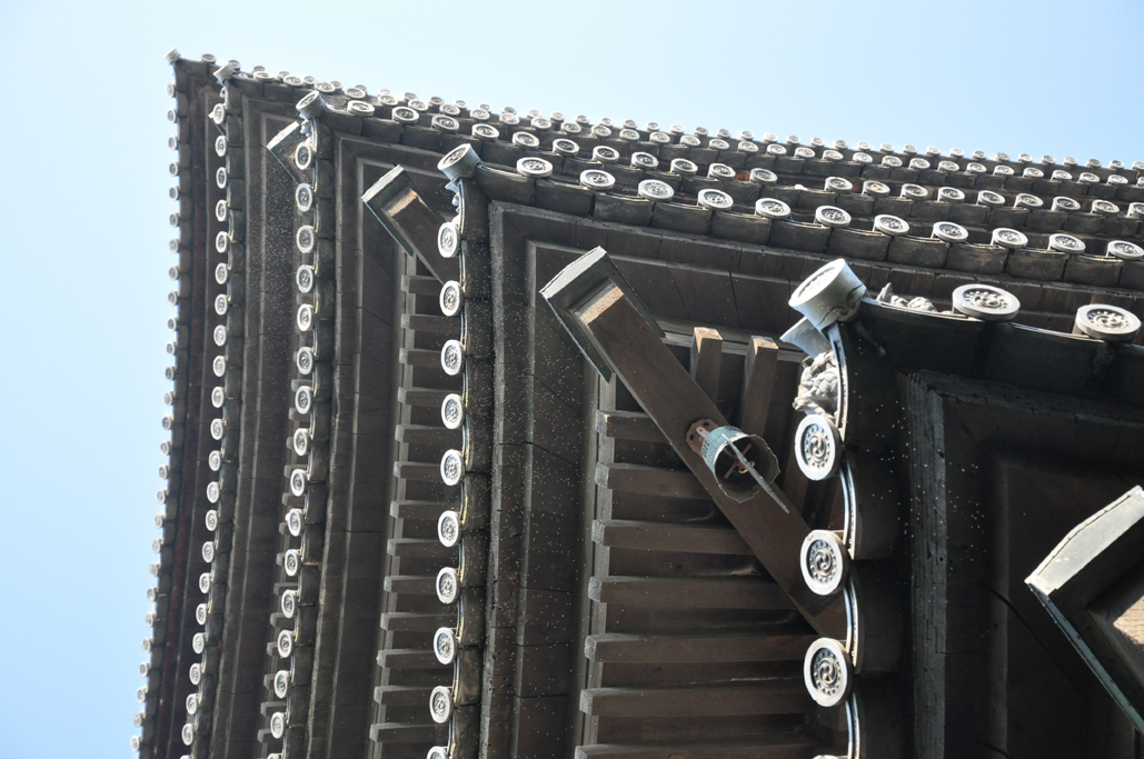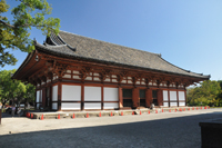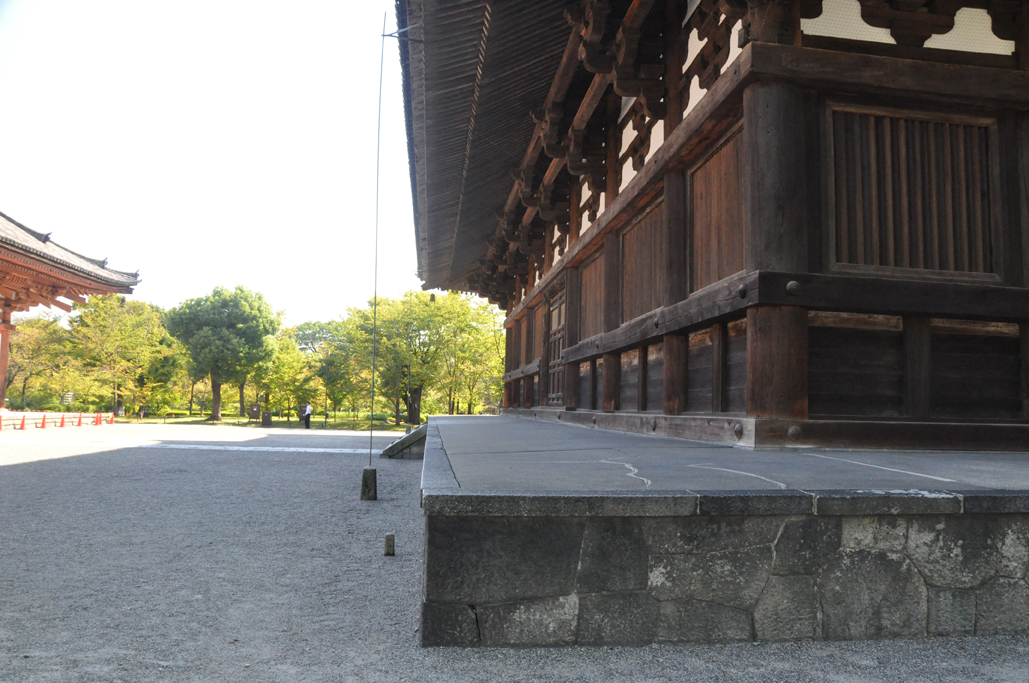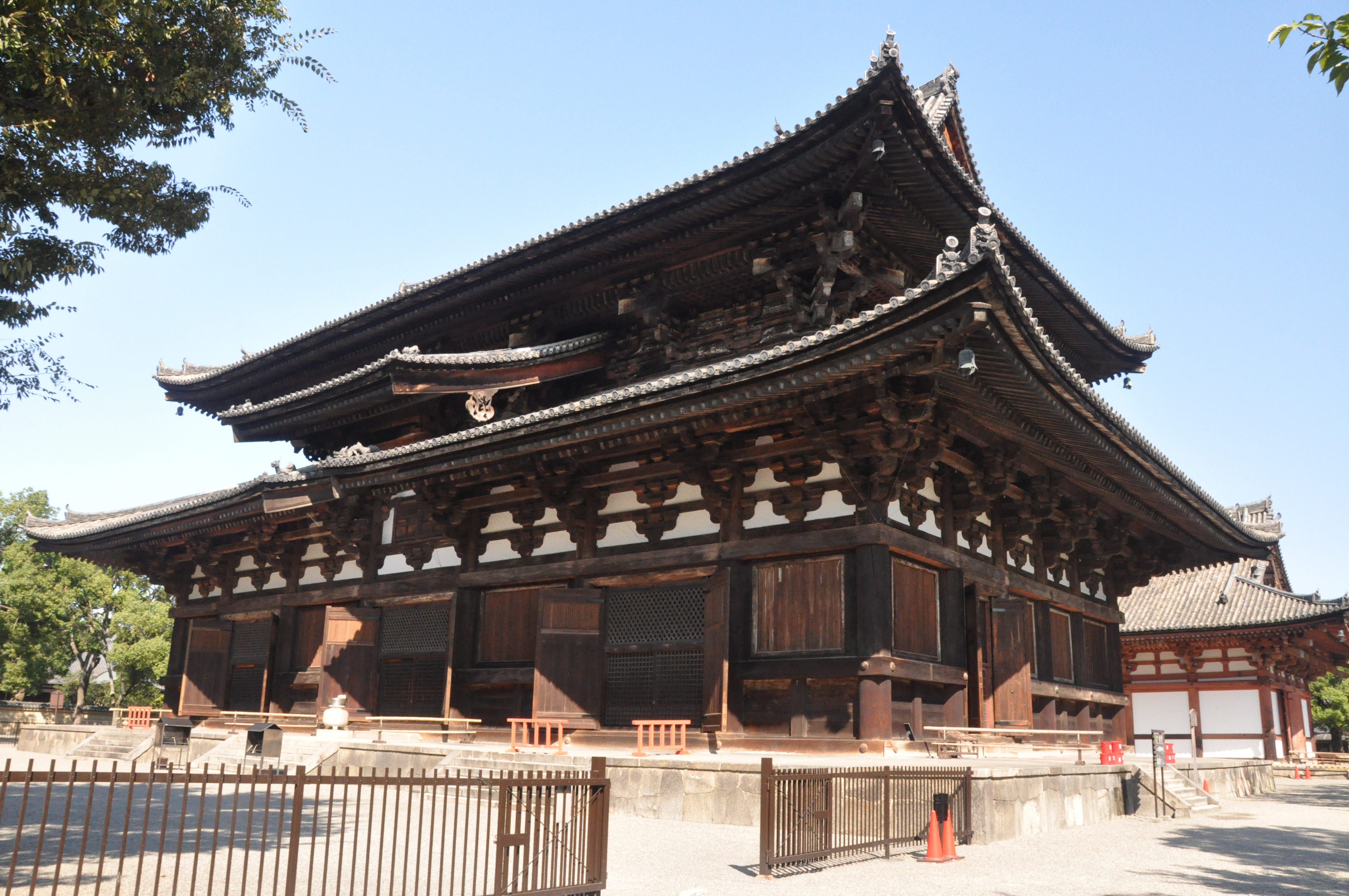 Considered a national treasure, To-ji's Kondo hall is the largest building within the temple complex. Like the pagoda, it was destroyed by fire and rebuilt during the Edo period. It is rectangular shaped, dark brown, with wood louvered paneling. Because of the risk of fire, it is common to stacks ofred water buckets around the complex. The Kondo houses a large statue of Yakushi Buddha venerated for its healing powers. It is flanked on each side by the Nikko and Gakko Bosatsus.