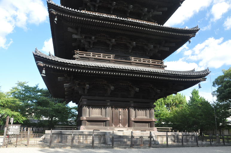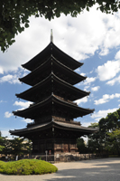 Toji's five storey pagoda stands 180 feet tall, and is the tallest wooden tower in Japan. Originally built by Kukai 826, the current structure dates from the Edo period (1695). The ground floor contains four Buddha statues which are not displayed at predictable times.